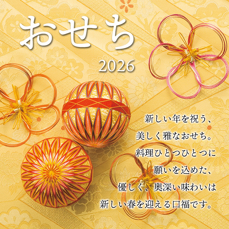 伝統の技と感性が光る、華やかな二段重。 歴史と伝統が培ってきた日本料理 × 彩り豊かなフレンチ料理。 皆様の一年が、 健康と繁栄に満ち溢れますように ーそんな思いを込めた逸品を、どうぞご堪能ください。